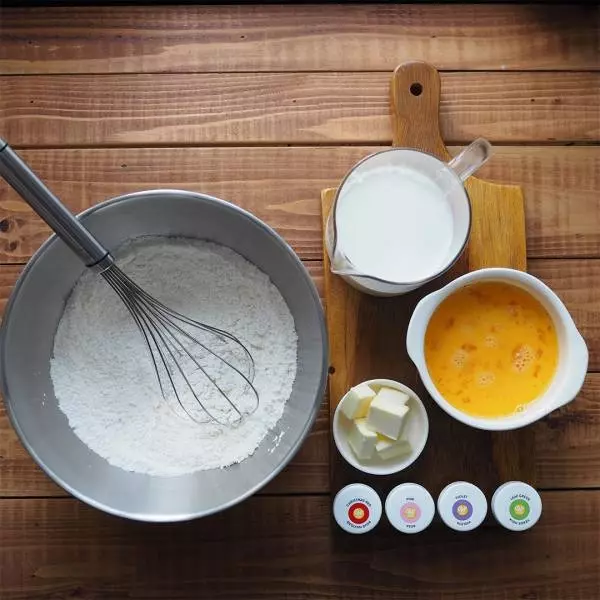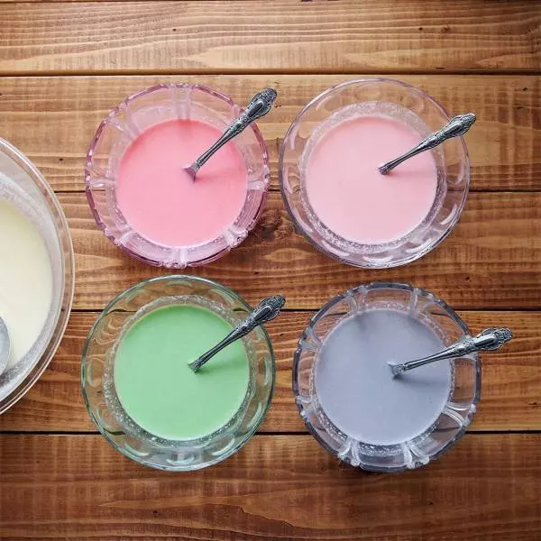 ⑤休ませた生地をお玉1杯分ずつ4つの器に分け、お好みの色に着色する。