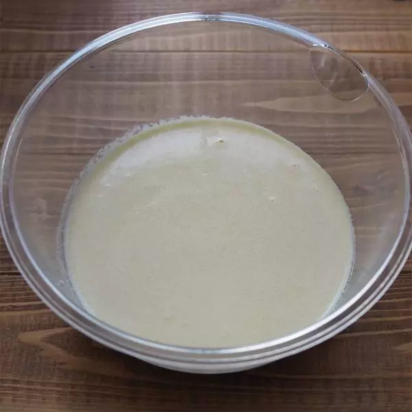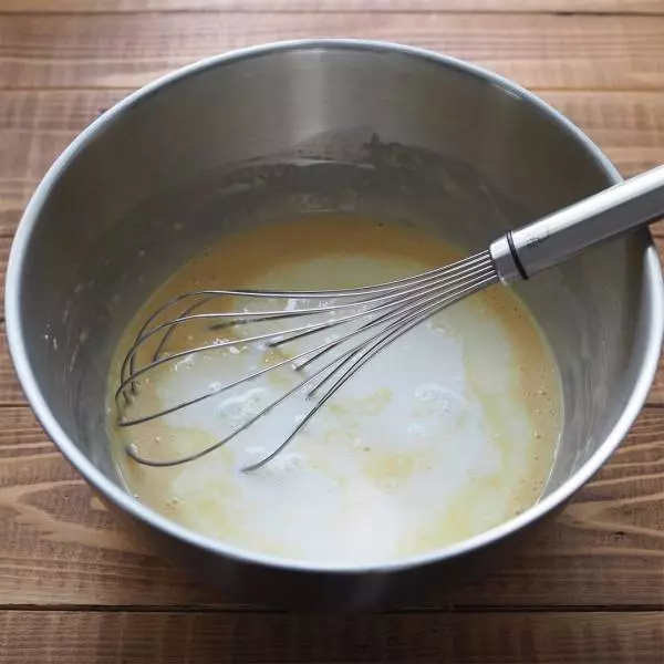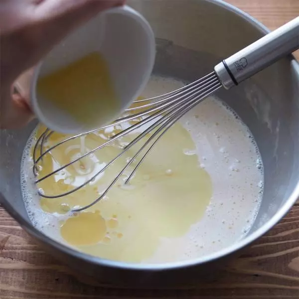 ③残りの牛乳を加えて混ぜ、溶かしたバターを加えて混ぜる。
