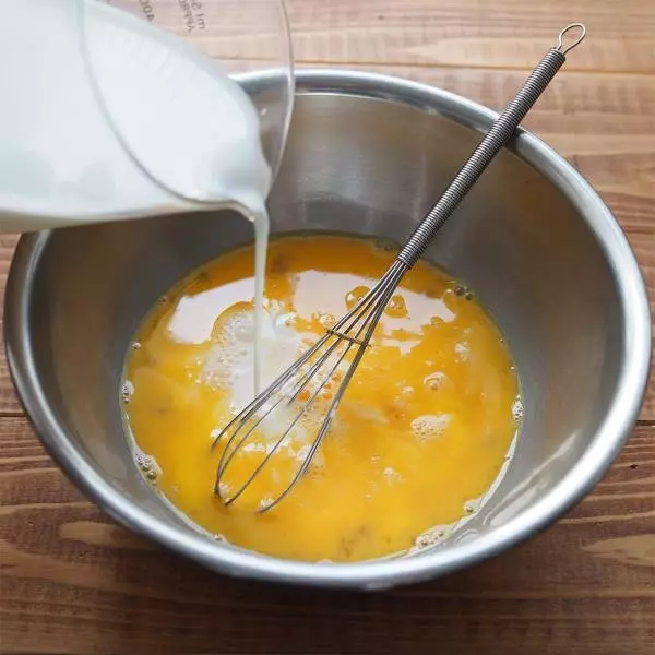 ①溶き卵をボウルに入れ、牛乳の半量を入れて混ぜる。