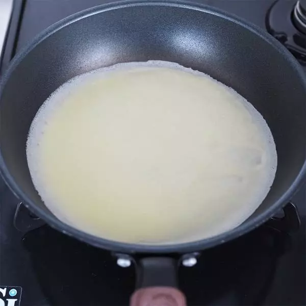 ⑥フライパンにサラダ油を薄くひき、弱火にかける。お玉半量の生地を流し入れ、広げる。