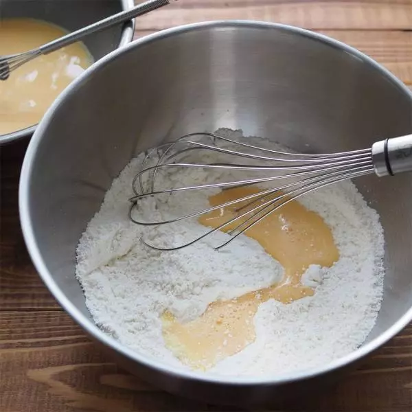 ②薄力粉とグラニュー糖が入ったボウルに①を少しずつ加えて、なめらかになるまで混ぜる。
