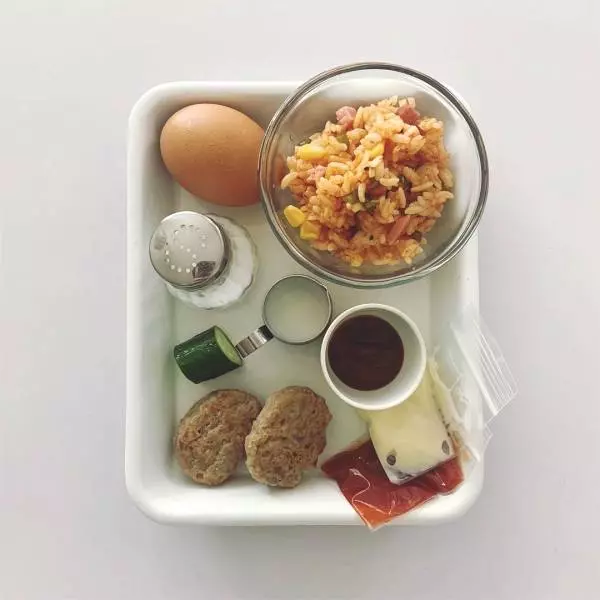 ・ケチャップライス……100g・お弁当用冷凍ミニハンバーグ……2個・卵……1個・塩……少々・牛乳……小さじ2・キュウリ……2cm・ケチャップ、ソースを同量で混ぜたもの……適量・ケチャップ、マヨネーズ(ジップ付きビニール袋に入れて角をカットする)……適量つくり方