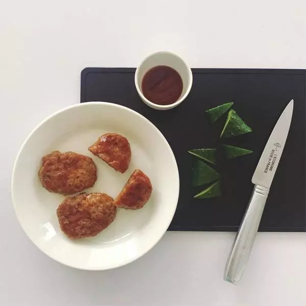 ➀冷凍ミニハンバーグをレンジで解凍し、ひとつは横半分、もうひとつは厚さを半分にする。