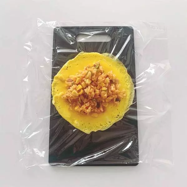 ➁卵に塩を入れて薄焼き卵をつくり、広げたラップの上に乗せて、その上にケチャップライスを乗せる。
