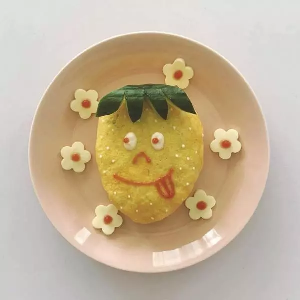 可愛らしい顔が特徴の【イチゴオムライス】。まわりにはチーズで型抜きしたお花をちらしてキュートに。イチゴのヘタはなんとキュウリ! 自由に顔を描いていろいろな表情をつくってみて♪