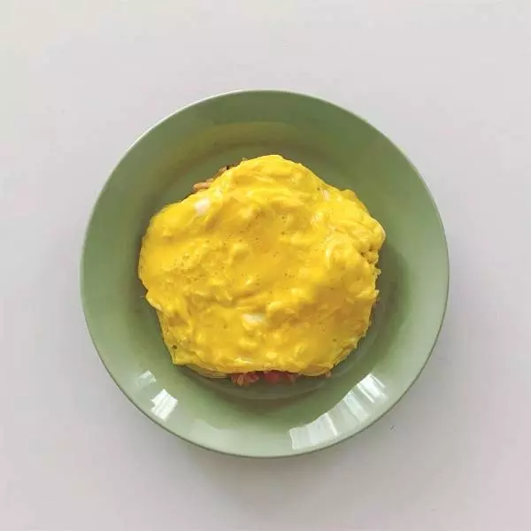 ➁事前に用意しておいたケチャップライスをお皿に丸く広げる。卵に塩、牛乳を加えて半熟卵焼きをつくり、ケチャップライスの上に乗せる。