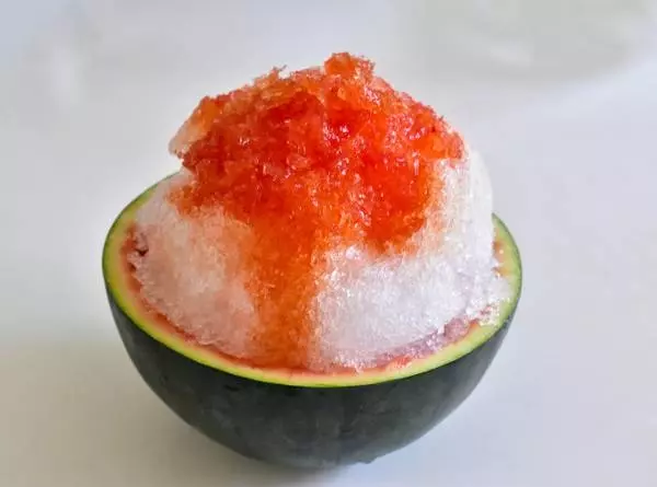 ⑤かき氷機で氷を削り、スイカの皮の中に入れていく。写真のように盛る。