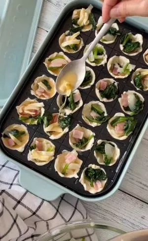 ①たこ焼き器にサラダ油をひいて、写真のように餃子の皮を並べる。