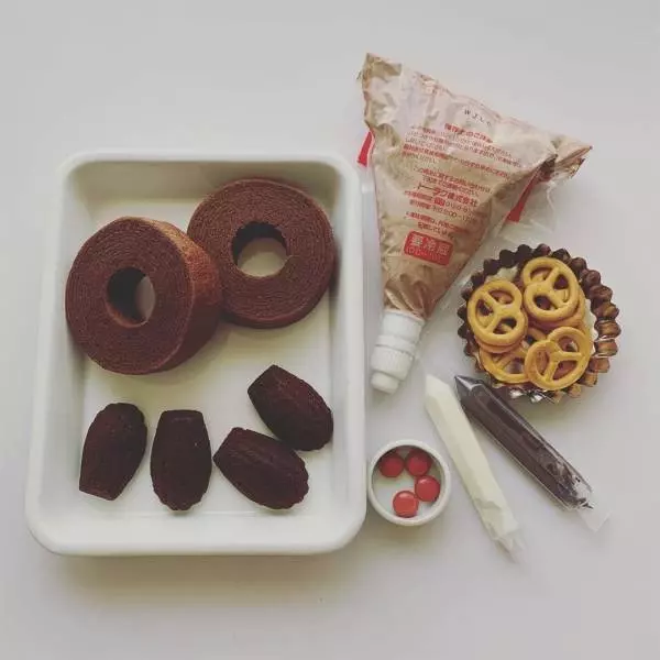 ①お湯で溶かしたチョコペン(茶)を使って、ミニマドレーヌにプレッツェル、マーブルチョコ(赤)を付ける。