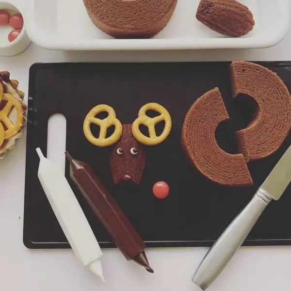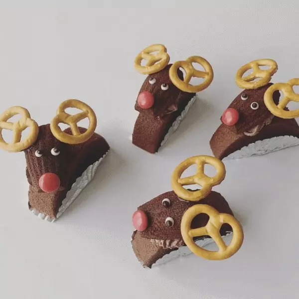 バウムクーヘンを体に、マドレーヌを顔に見立てて市販のお菓子をくっつけたら、ミニサイズの可愛らしいトナカイバウムの完成! 顔だけではなく、体までつくるとトナカイらしくなって、プチスイーツとしてもぴったりなボリュームに。たくさんつくって並べたい!