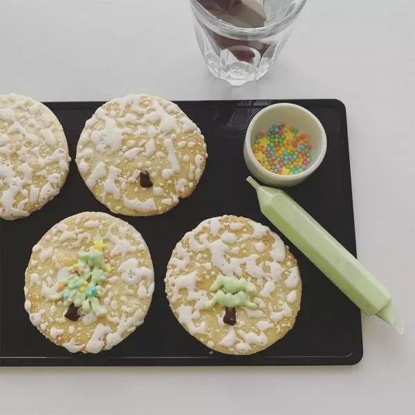 クリスマスに珍しい和菓子を使った、ツリーおせんべい。雪景色のような『雪の宿』のおせんべいをベースに、チョコペンなどで飾り付け。トッピングはアラザンやチョコスプレーを使うと、よりクリスマス感が出るのでおすすめ。ラッピングしてプチギフトにしても◎。