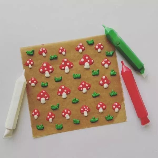 ②キノコを12個、チョコペン(緑)を使って草を12個描いて固める。どちらも大小のサイズがあるといい。