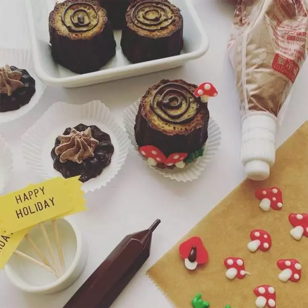 ④カットしたカヌレの上部をマフィンカップに乗せてホイップクリームを絞る。固まった②のキノコと草をチョコペン(茶)でカヌレに貼り付ける。ホイップクリームの上に乗せてピックを挿せば、出来上がり!