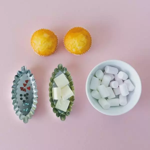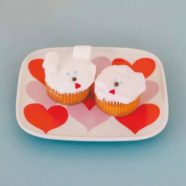 プチサイズのカップケーキを土台に、マシュマロを溶かしてトッピングでプードルにしたカップケーキ。マシュマロは、白以外にもピンクなど色付きのものを使うとバレンタイン感アップ! 男の子&女の子に見立てて、2個セットでつくるのがおすすめ。