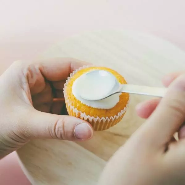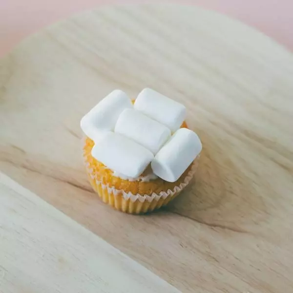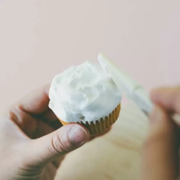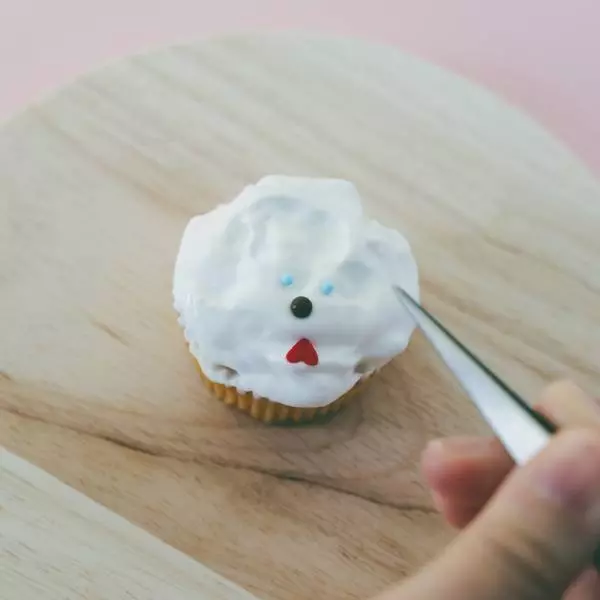 ②マシュマロの仮止め用に、湯せんかレンジで溶かしたホワイトチョコをカップケーキの表面に塗る。