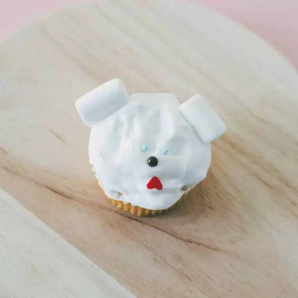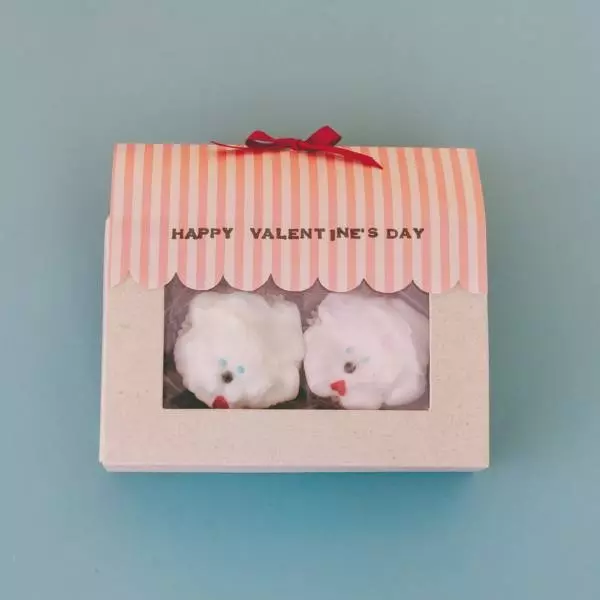 セット感が可愛いプードルのマシュマロカップケーキは、100円ショップの窓付きボックスに。折り紙で屋根をつくってリボンをつけたら、ワンちゃんハウスのでき上がり! スタンプを自由に押したり、シールを貼ったり、デコレーションも楽しめる♪