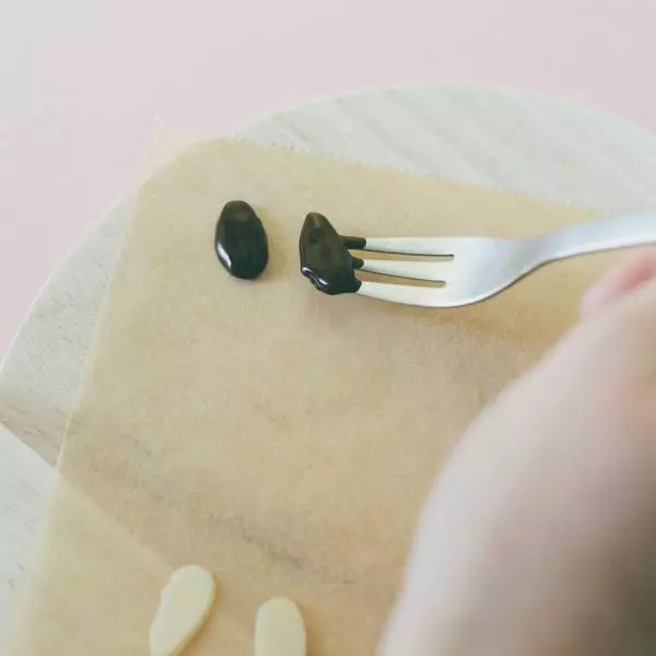 ①ビターチョコを湯せんかレンジで溶かして、耳になるアーモンドスライスをコーティングして乾かす。