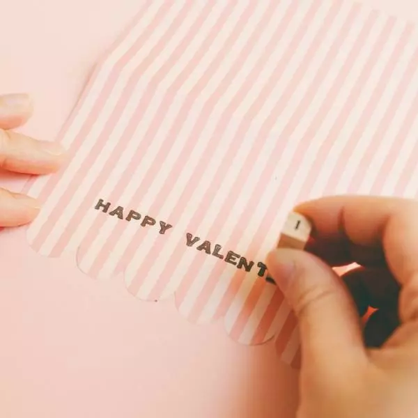 ②半分に折って折れ線をつけ、片面にスタンプで自由に文字を押す。手描きでもOK。