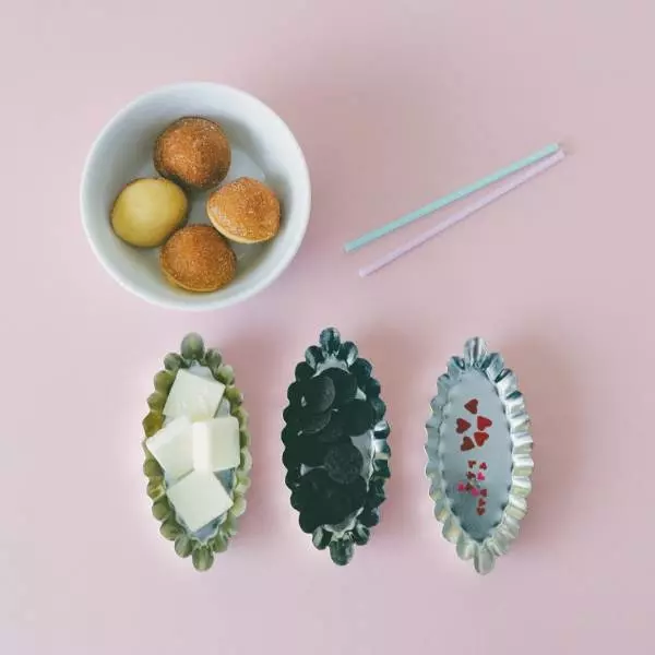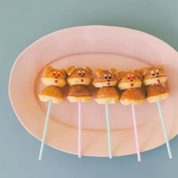 ひと口サイズの鈴カステラが愛くるしい柴犬に変身! カラフルな棒に刺して、ロリポップ風にすると子どもも喜ぶこと間違いなし。柴犬の目をハートに代えれば、バレンタイン仕様になってラブリーな印象に。たくさんつくってバレンタインを盛り上げて!
