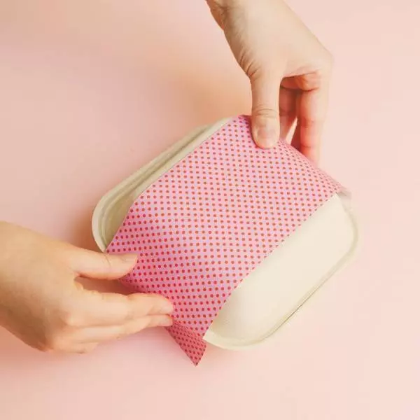 ②紙の裏の両端に両面テープを貼り、ボックスを包むように貼る。