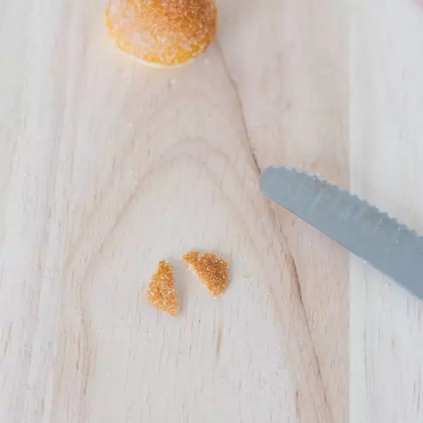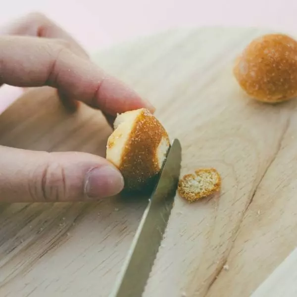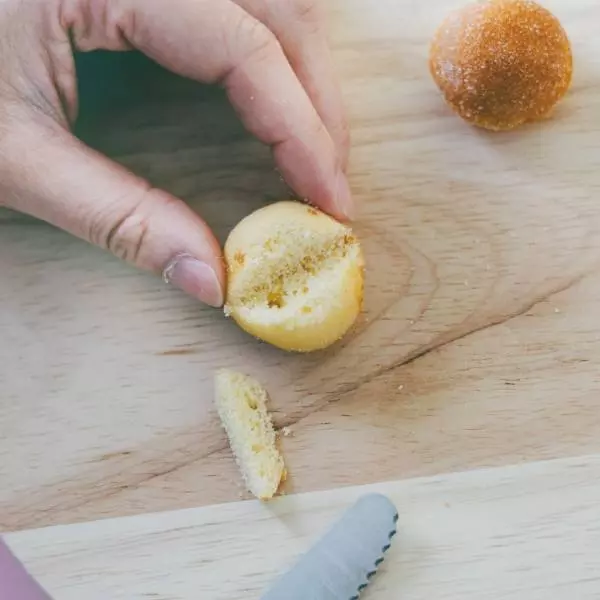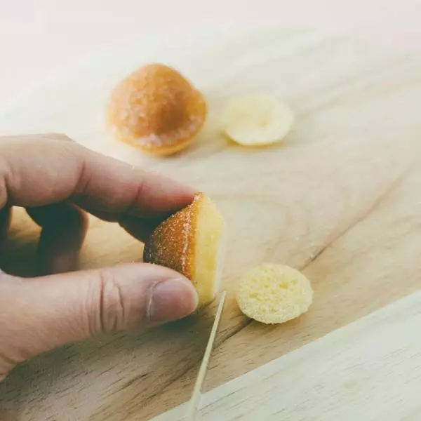 ③ ②の脚になる鈴カステラの茶色い部分の上部を少し切る。