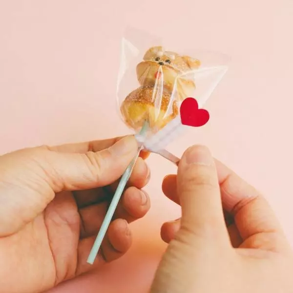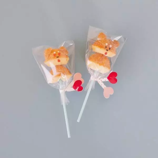 ロリポップ風にした鈴カステラ犬に、透明の袋をかぶせてリンゴ飴のようにラッピング。ラッピングタイの先には、ハートのシールを貼り合わせてアレンジをプラスすると、よりキュートな仕上がりに。いくつか集合させると可愛いので、たくさんつくってみて♪
