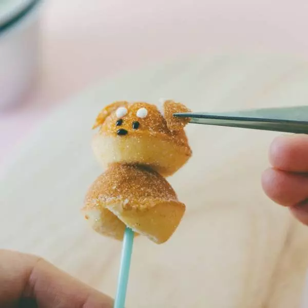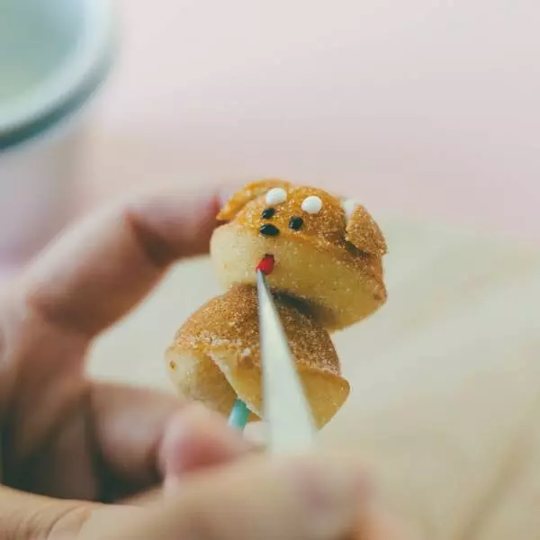 ⑤脚→頭の順にスティックに刺し、湯せんで溶かしたビターチョコで目と鼻を、ホワイトチョコで眉を描く。