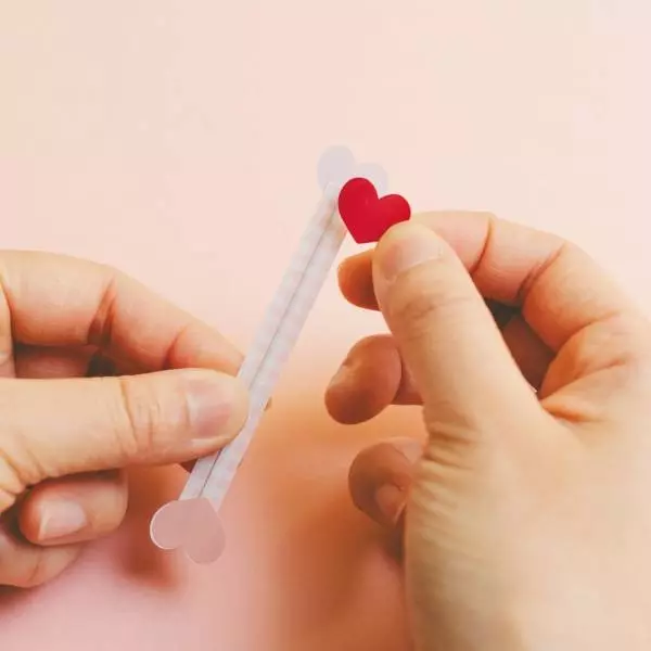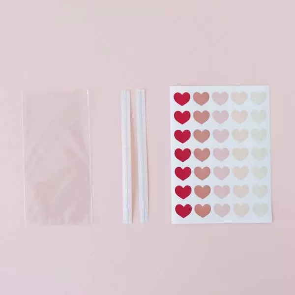 ①ラッピングタイの両端にハートのシールを貼り合わせる。