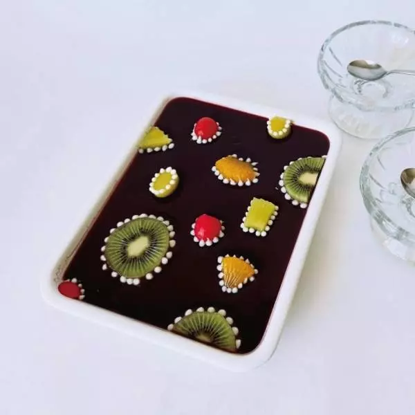 バットに大きくつくったぷるぷるゼリーの上にフルーツを散らして、まわりをチョコペンで囲むと、まるで宝石のよう! フルーツはカラフルな種類を選ぶと華やかさアップ。宝石感が出るように、ゼリーはぶどうジュース(コーヒーゼリーでも)など濃い色にするのがポイント。