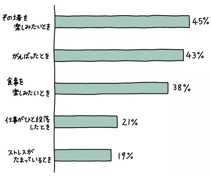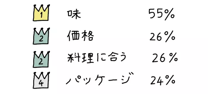 ダントツの1位が味を重要視するという答え。スペシャルな気分を味わうために、おいしさは絶対ゆずれない! また、価格と料理に合うかどうかという答えが同率2位にランクイン。食事を楽しみたいときに飲むママにとって、料理と相性のよいお酒を選びたい様子。
