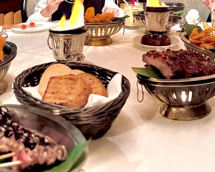 非日常な空間で、珍しい料理が味わえるレストラン。おすすめのメニューは、貝殻型のスープボウルが可愛い「牡蠣とホウレンソウのクリームスープ “ボンゴ ボンゴ” 」や、卓上で自ら仕上げる牛串焼き「ビーフ チョーチョー」。