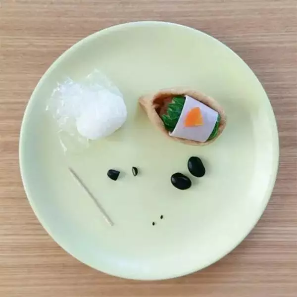 2023年2月22日 12:00④スヌーピーの顔をつくる。残りのおにぎりを③の上にそっと詰め、黒豆を両サイドに置き耳をつくる。鼻には黒豆を3分の1ほどにカットしたものを添え、目は黒ごまでつくる。