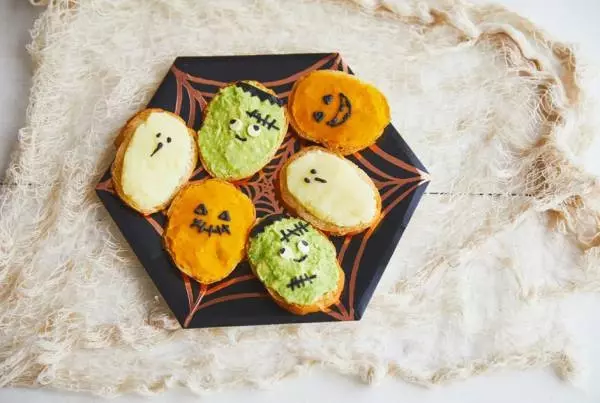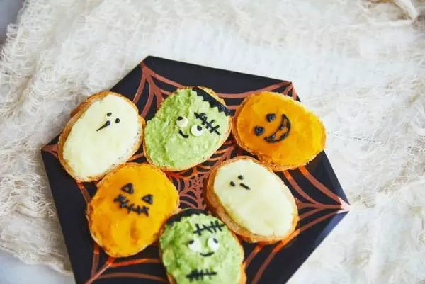 薄切りのバゲットに3色の野菜ペーストを塗って、海苔やスライスチーズで表情をつけるだけ。あっという間に、ユニークなモンスターやオバケのできあがり♪盛り付けは、蜘蛛の巣柄の紙皿に3色がランダムになるように並べて、にぎやかさを演出しました。【材料】(4人分)★オバケ