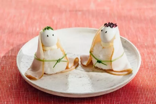 インパクト抜群『おひなさま見立て ハムとうずら卵の手まり寿司』。