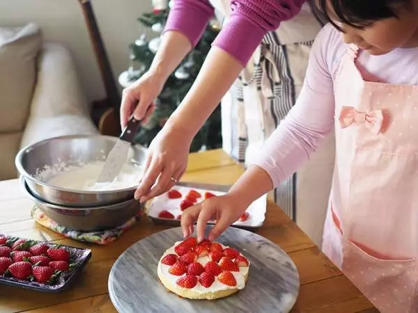 子どものお手伝いPOINT!工程2のカットしたイチゴをケーキに置くところと、工程4の生クリームを塗っていく作業がおすすめ。ナッペの仕上げはママにバトンタッチ。