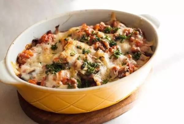 ベーコンの旨みとトマトのこっくりとした味わいが絶品のトマトグラタン。口に入れると、おいしさがじゅわ~と広がります。