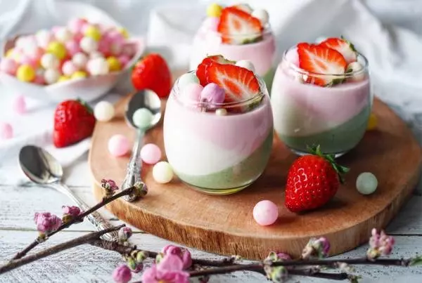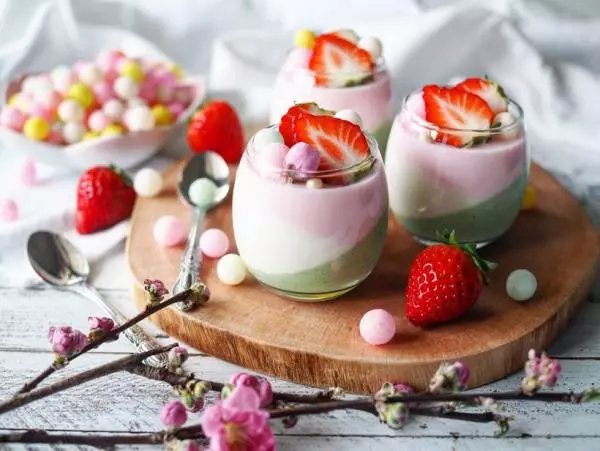透明なグラスを使って三色のプリンをななめに固めていけば、お店みたいなおしゃれなスイーツに! トッピングでイチゴや雛あられを添えて、お祝いにぴったりな華やかさもばっちり。
