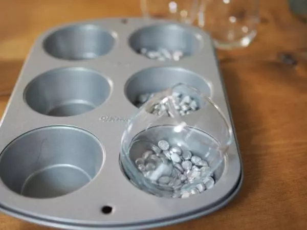 マフィン型にタルトストーンを敷きつめ、グラスを斜めにセットしておく。