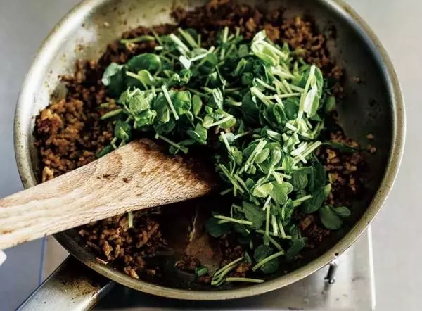 行程2で最後に豆苗を加えて炒めること。シャキシャキの食感を楽しめる。
