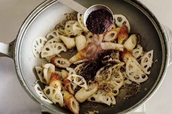 最後にゆかりを加えて具材に味付けすることで、ゆかりの風味が保たれる。