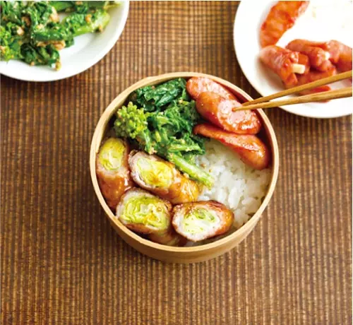 次に「ウインナーのケチャップ炒め」を詰める。お弁当のスペースを占める割合が、2の「菜の花のゴマ和え」よりもやや少なめになるようにすると好バランス。