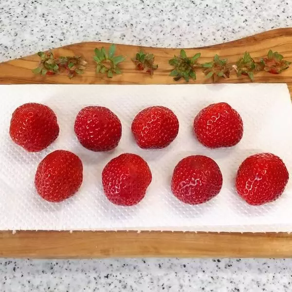 3.イチゴを洗ってヘタを取り、キッチンペーパーなどで水気をとっておきます。