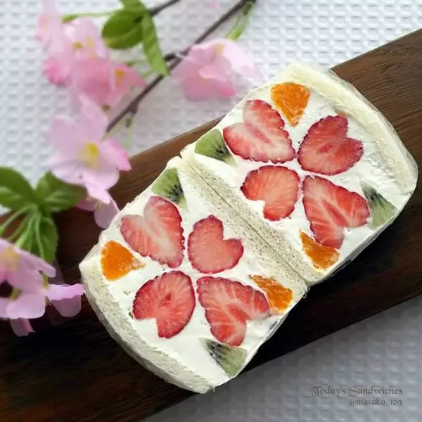 厚さ8cmのわんぱくサンドには、春にぴったりの桜がモチーフ。ハート型のイチゴをアレンジを活用し、散らしたキウイやミカンがアクセント!