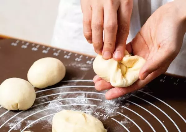 生地表面に打ち粉(強力粉分量外)をふり、生地を台にやさしく取り出し、5等分(約55g)にする。手のひらで気泡を抜き、外から内へ表面の生地がピンと張るように丸める。布巾を被せ、生地を10分休ませる。