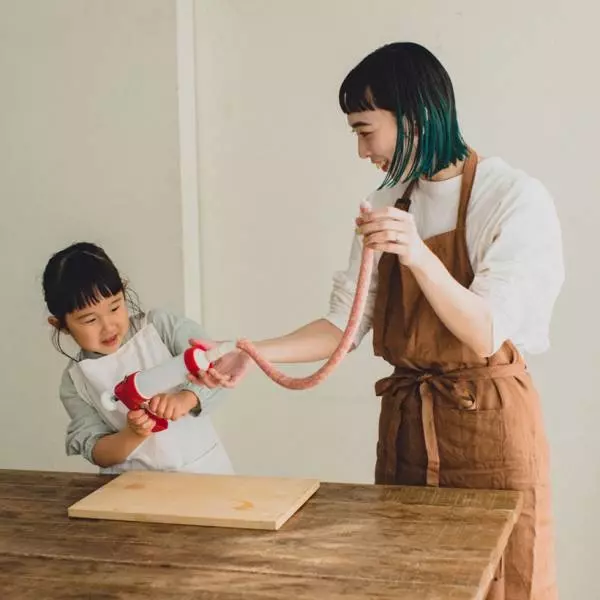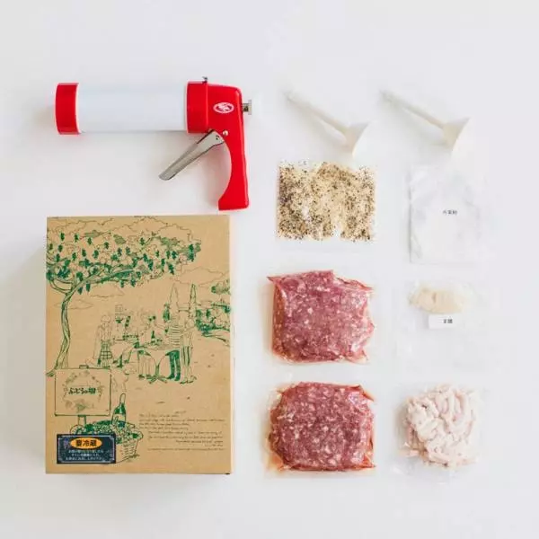 九州で採れた旬の食材を使い、ホテルやレストランを展開する『ぶどうの樹』の食育プロジェクト「冒険まるしぇ」の体験キット。キットの材料も鹿児島県産で、添加物をできるだけ使わないことがこだわり。鉄砲みたいな機械を使って羊腸にミンチ肉を詰めていく作業は、子どもも大喜びするはず。詰め終わったら、ひねってサイズを調整して、鍋で茹でたらあっというまに完成!