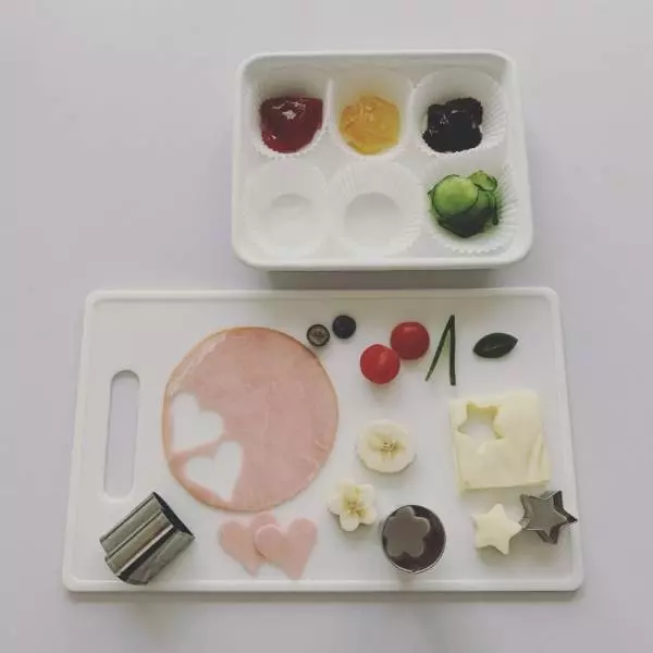 ★の具材を用意する。キュウリをスライサーで輪切りにし、塩もみにする。写真を参考に、キュウリの皮部分をサクランボの茎、葉っぱに見立ててカットする。ミニトマトを縦に半分に、ブルーベリーを横に半分に切る。ハムはハート型に、折りたたんで厚くしたスライスチーズは星型に、バナナの輪切りは花型にくり抜く。ゆで卵を飾り切りにする。