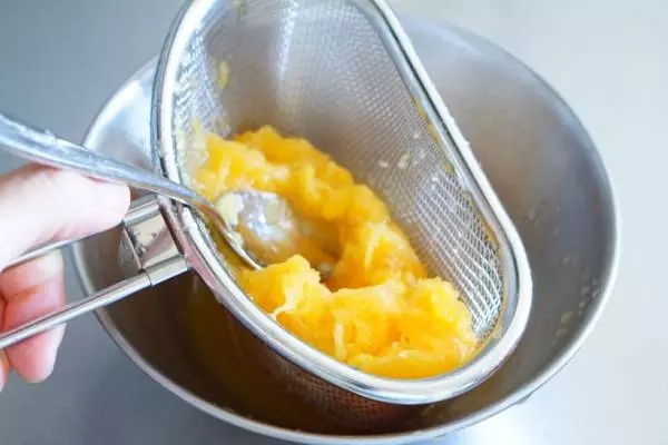 くり抜いたオレンジの果肉をザルに入れて絞る。