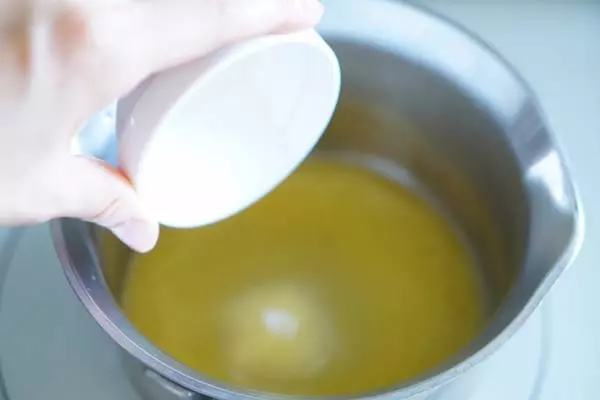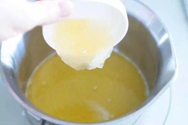 ➃のうち50gほどを鍋に入れ、砂糖を入れて60℃まで温める。