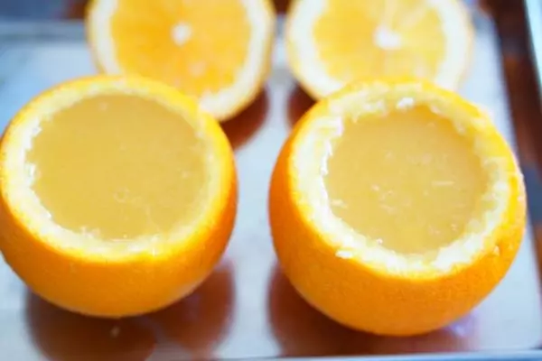 ➁でつくったオレンジの容器に➆のゼリー液を入れ、しっかりと固まるまで冷蔵庫で冷やす。口溶けなめらかな、とろりとしたオレンジゼリーの完成!