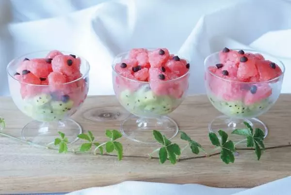 夏フルーツの定番・スイカをシャーベットにアレンジ。グリーンの皮の部分はキウイで表現&種に見立てたチョコチップの食感がアクセントに♪